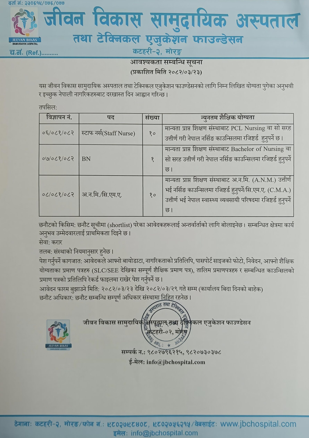 Staff Nurse, ANM/CMA, BN – 21 Vacancies Full Time Morang Posted 3 months ago Applications have closed Website Jeevan Bikas Samudayik Aspatal Tatha Technical Education Foundation JOB OPPORTUNITY Tagged as: Morang
