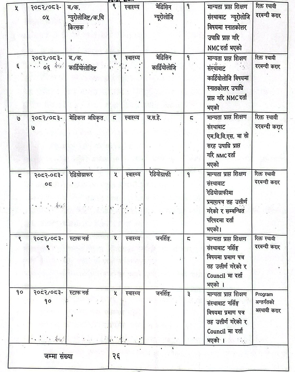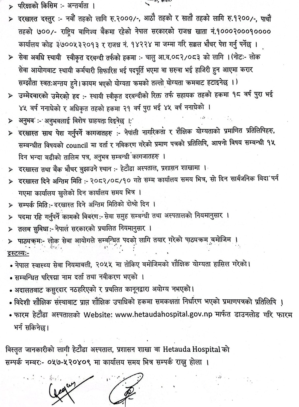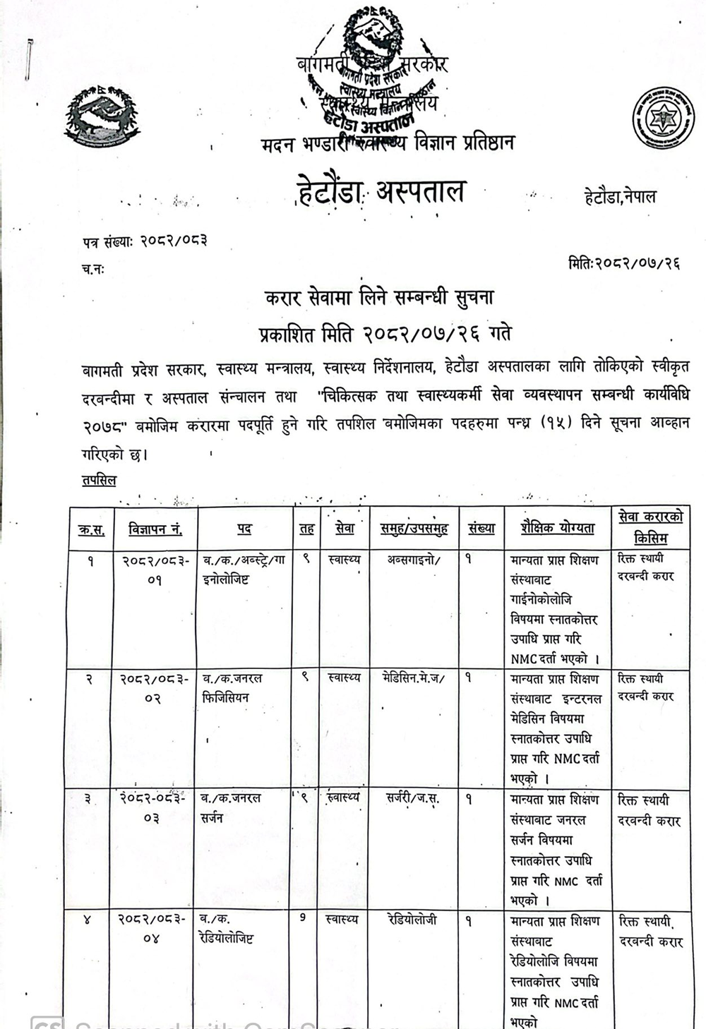 Staff Nurse, Radiographer, Medical Officer, Cardiologist, General Surgeon, General Physician Full Time Hetauda Posted 6 days ago Closes: November 26, 2025 Website Hetauda Hospital JOB OPPORTUNITY Tagged as: Hetauda To apply for this job please visit hetaudahospital.gov.np.
