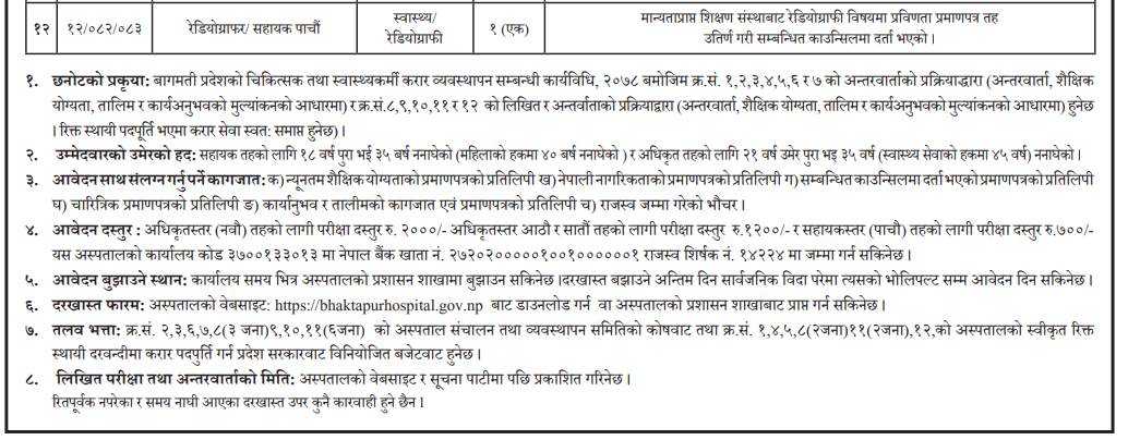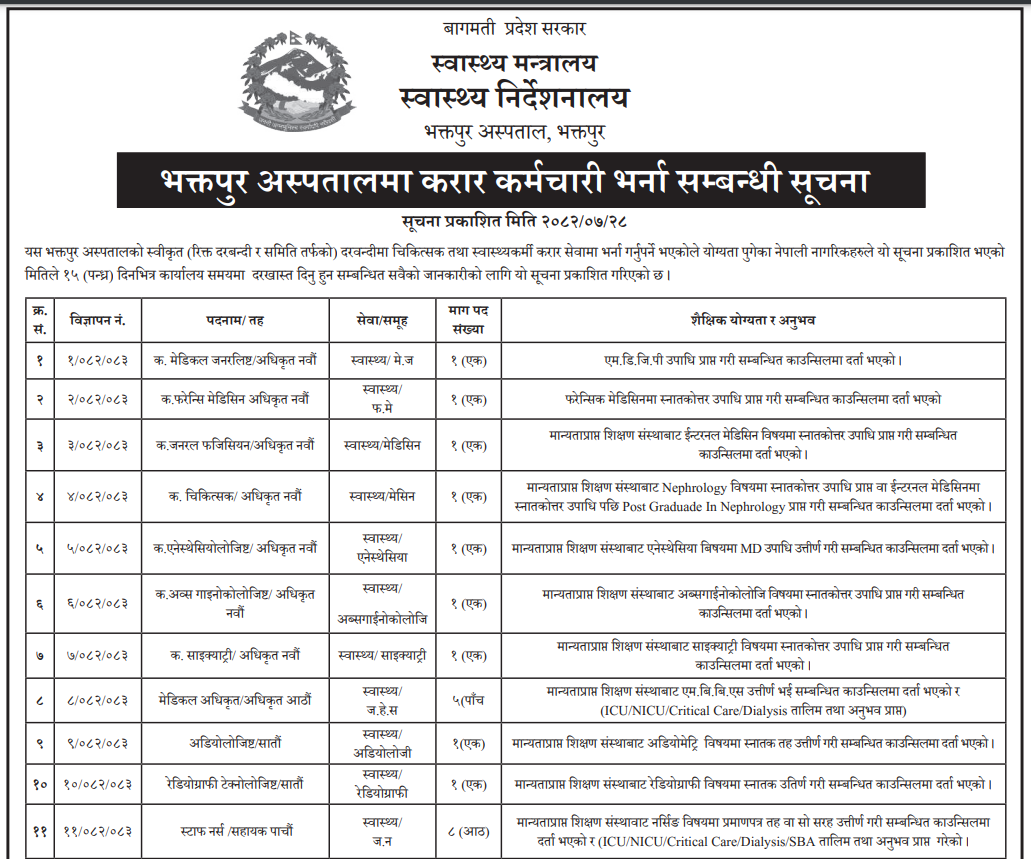 Staff Nurse, Radiography Technologist, Audiologist, Medical Officer, Physician, Anesthesiologist Full Time Bhaktapur Posted 1 day ago Closes: December 12, 2025 Bhaktapur Hospital JOB OPPORTUNITY Tagged as: Bhaktapur
