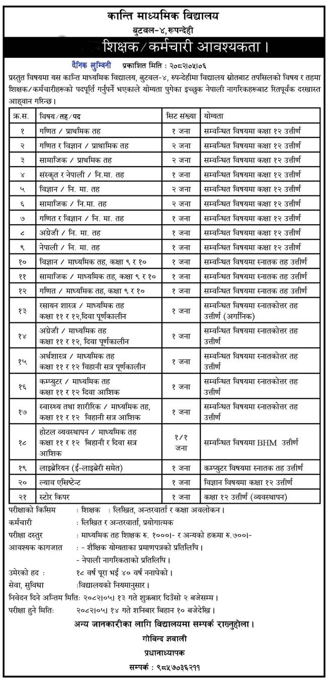Storekeeper, Lab Assistant, Teacher (Math, Science, Social, Nepali, English, Chemistry, Economics, Computer, Hotel Management) Full Time Butwal, Rupandehi Posted 1 month ago Applications have closed kanti Madhyamik Vidyalaya JOB OPPORTUNITY Tagged as: Butwal