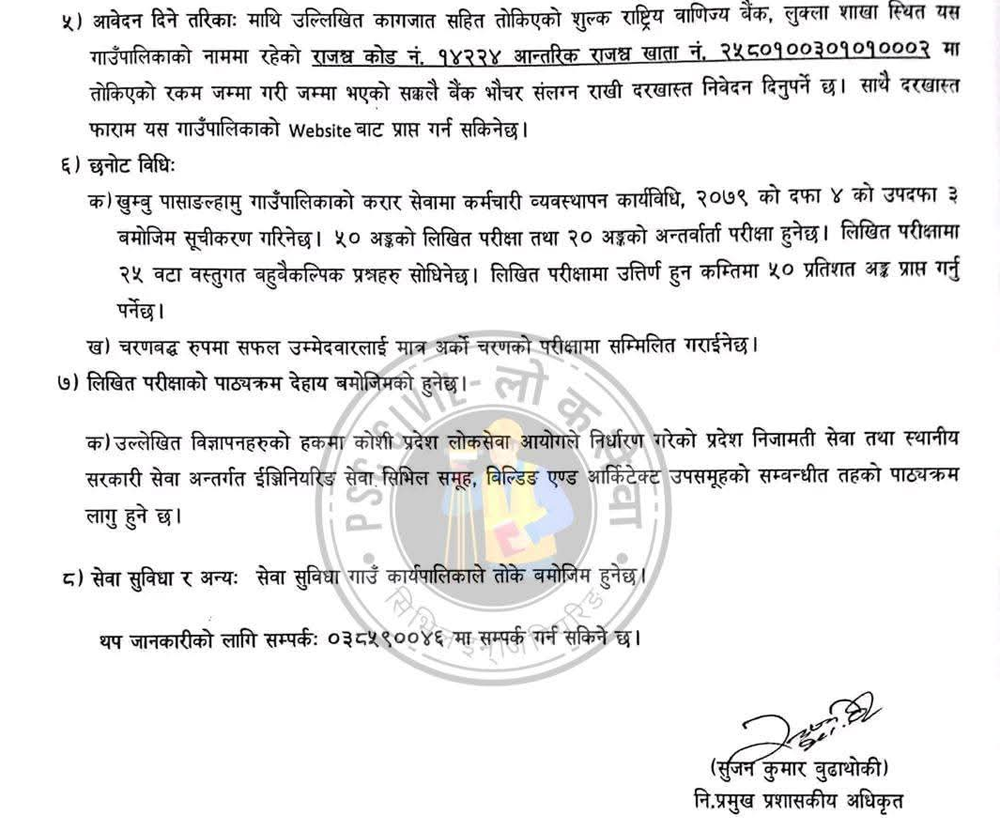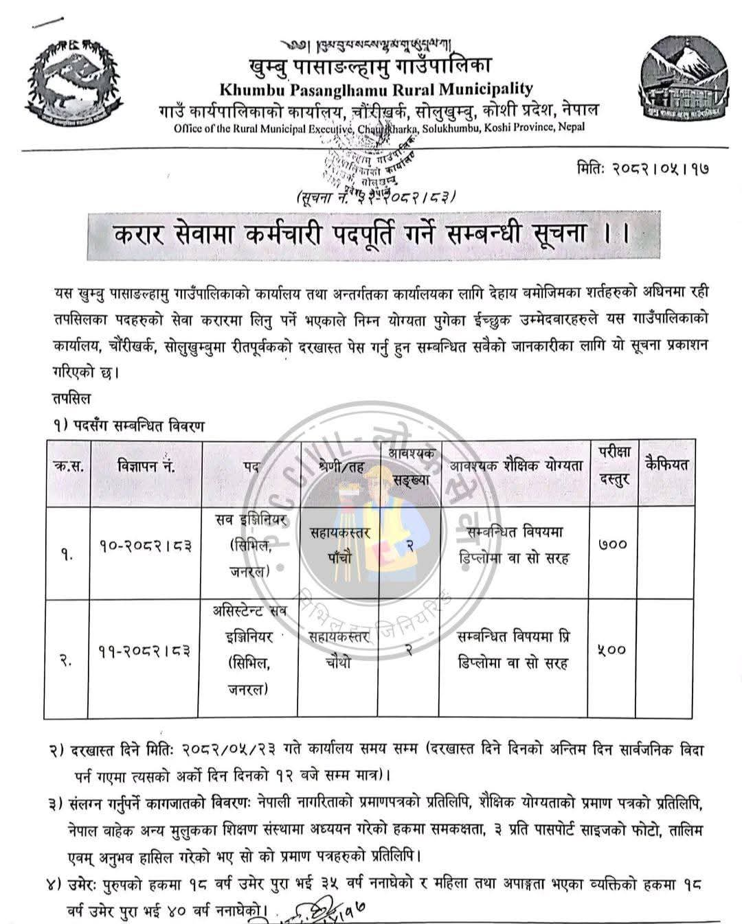 Sub Engineer (Civil), Assistant Sub Engineer (Civil) Full Time Solukhumbu Posted 4 weeks ago Applications have closed Website khumbupasanglhamu Gaunpalika JOB OPPORTUNITY Position: Sub Engineer (Civil) No. of Vacancy: 2 Position: Assistant Sub Engineer (Civil) No. of Vacancy: 2 Location: Solukhumbu khumbupasanglhamu Gaunpalika Phone No.: 038590046 Tagged as: Solukhumbu