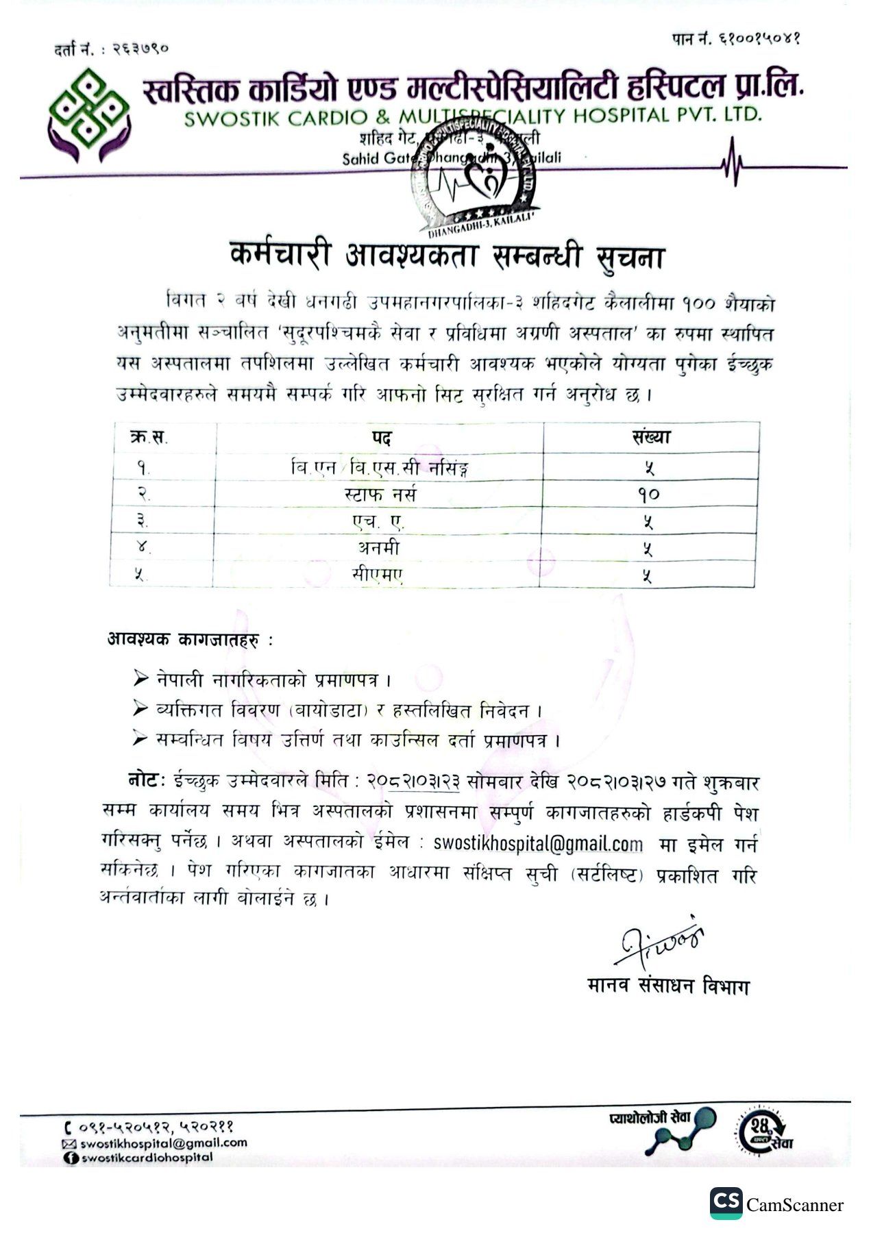 Staff Nurse, ANM, Health Assistant, CMA – 30 Vacancies Full Time Kailali Posted 3 months ago Applications have closed Website Swostik Multispecialty Hospital Pvt. Ltd. JOB OPPORTUNITY Tagged as: Kailali