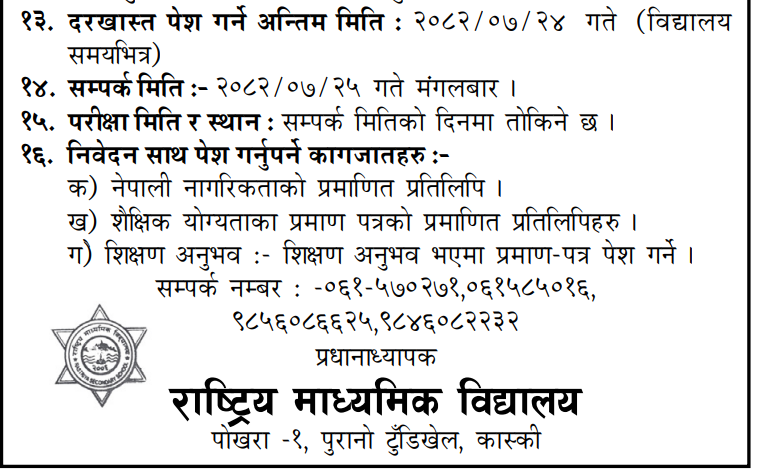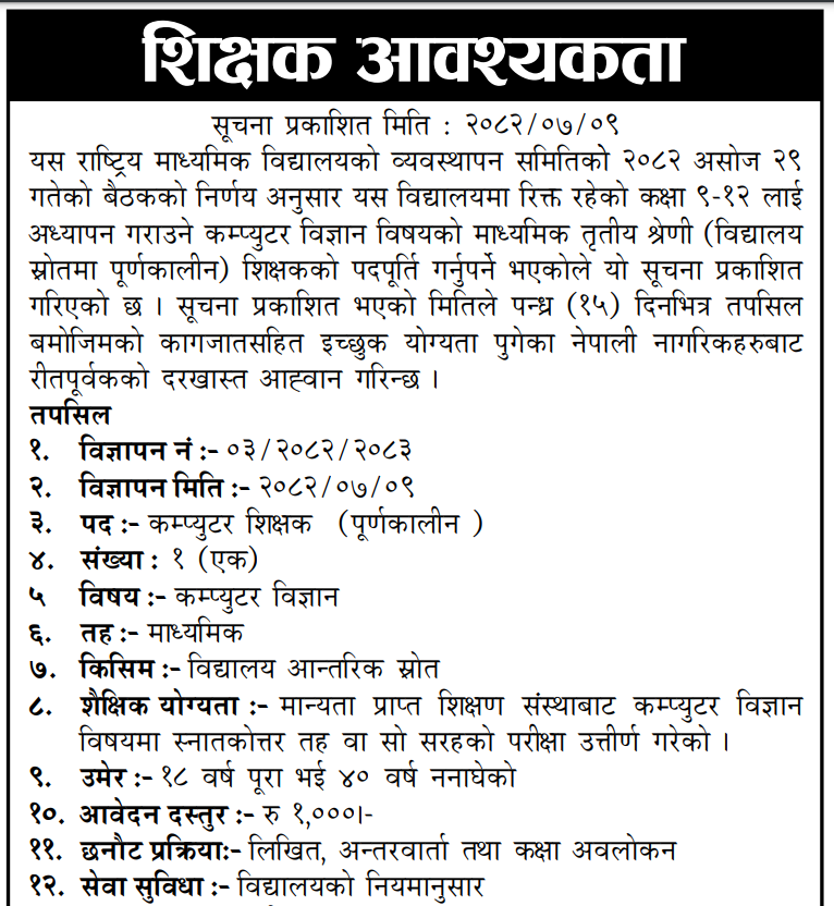 Teacher- Computer Science Full Time Pokhara Posted 3 weeks ago Applications have closed Rastriya Madhyamik Vidyalaya JOB OPPORTUNITY Position: Teacher Level: Secondary Subject: Computer Science No. of Vacancy: 1 Location: Pokhara Rastriya Madhyamik Vidyalaya Phone No.: 061-570271, 061-585016, 9856086625, 9846082232 Tagged as: Pokhara