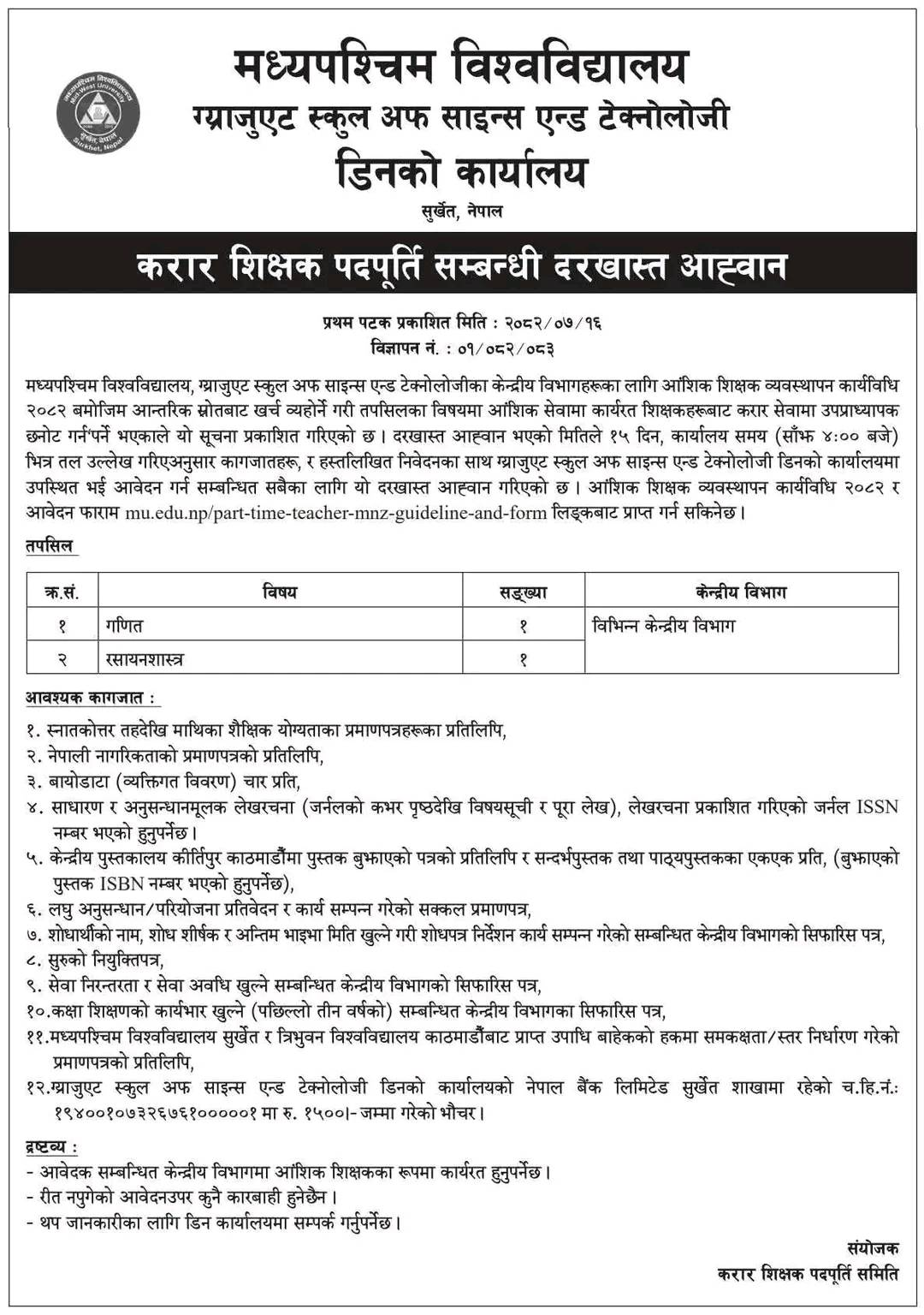 Teacher – Math, Chemistry Full Time Surkhet Posted 2 weeks ago Closes: November 17, 2025 Website Mid-West University JOB OPPORTUNITY Tagged as: Surkhe To apply for this job please visit www.mwu.edu.np.