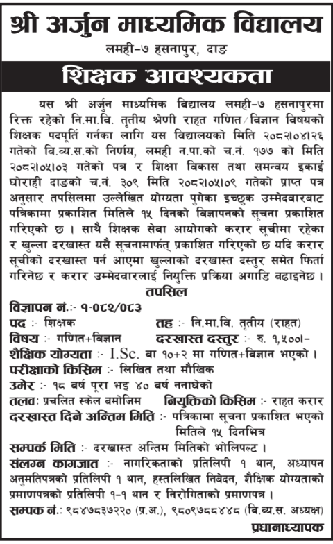 Teacher – Math/Science Full Time Dang Posted 3 weeks ago Applications have closed Shree Arjun Madhyamik Vidyalaya JOB OPPORTUNITY Position: Teacher Level: Lower Secondary Subject: Math+ Science No. of Vacancy: 1 Shree Arjun Secondary School Location: Dang Phone No.: 9847837220, 9809788448 Tagged as: Dang