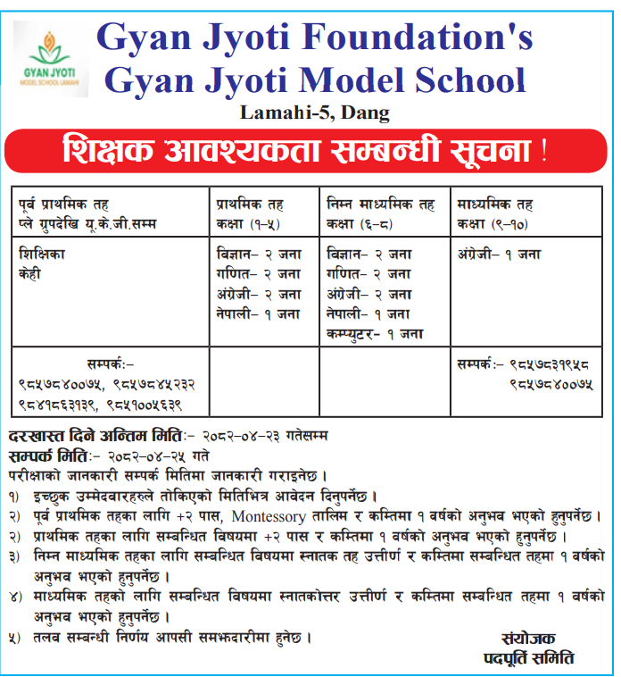 Teachers – Science, Math, English, Nepali, Computer Full Time Dang Posted 2 months ago Applications have closed Gyan Jyoti Model School JOB OPPORTUNITY Source: Naya Youg Bodh, 4 August, 2025 Tagged as: Dang