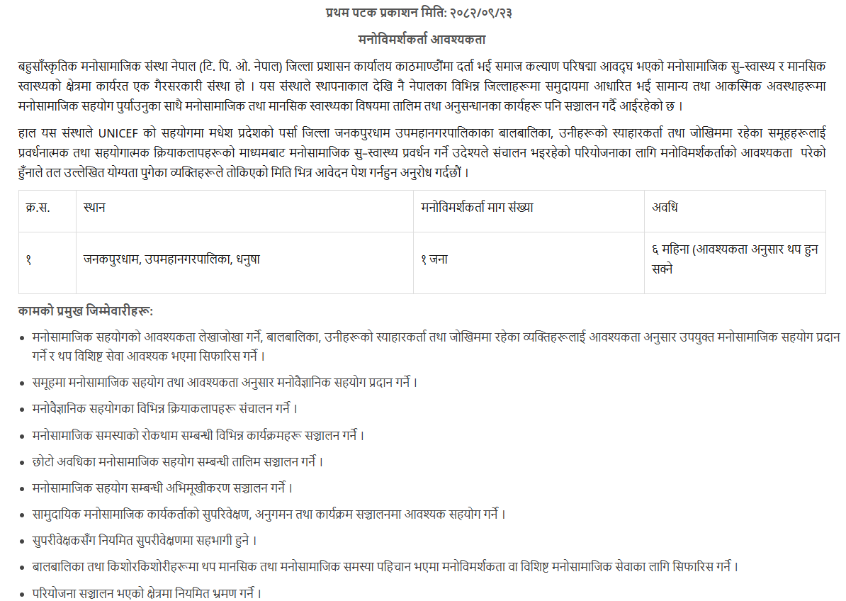 Psychologist Full Time Dhanusha Posted 2 days ago Closes: January 14, 2026 TPO Nepal JOB OPPORTUNITY Tagged as: Dhanusha Full name Email address Position Apply For Cover Letter/Message Upload CV Upload your CV/resume or any other relevant file. Max. file size: 40 MB. I accept the Terms and Conditions.
