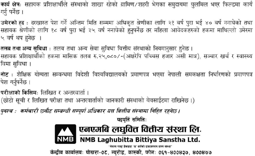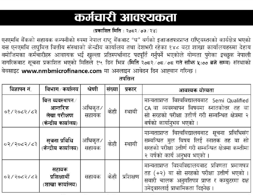 Trainee Assistant, IT Department, Finance / Audit Department Fresher Full Time Anywhere Posted 1 week ago Closes: November 24, 2025 Website NMB Laghubitta Bittiya Sanstha Ltd. JOB OPPORTUNITY To apply for this job please visit nmbmicrofinance.rigojobs.com.