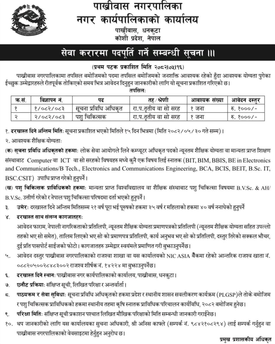Veterinarian, IT Officer Full Time Dhankuta Posted 1 month ago Applications have closed Website Pakhribas Nagarpalika JOB OPPORTUNITY Position: IT Officer No. of Vacancy: 1 Position: Veterinarian No. of Vacancy: 1 Location: Dhankuta Pakhribas Nagarpalika Phone No.: 9842108294 Tagged as: Dhankuta