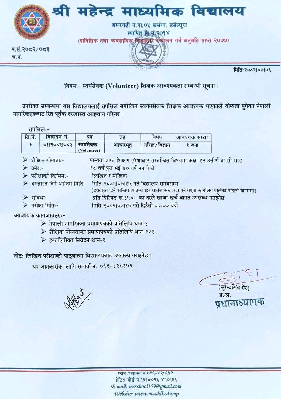 Volunteer Teacher – Math/Science Full Time Dadeldhura Posted 3 weeks ago Applications have closed Shree Mahendra Madhyamik Vidyalaya JOB OPPORTUNITY Position: Volunteer Teacher Level: Basic Subject: Math/Science No. of Vacancy: 1 Location: Dadeldhura Shree Mahendra Madhyamik Vidyalaya Phone No.; 096-420159 Tagged as: Dadeldhura